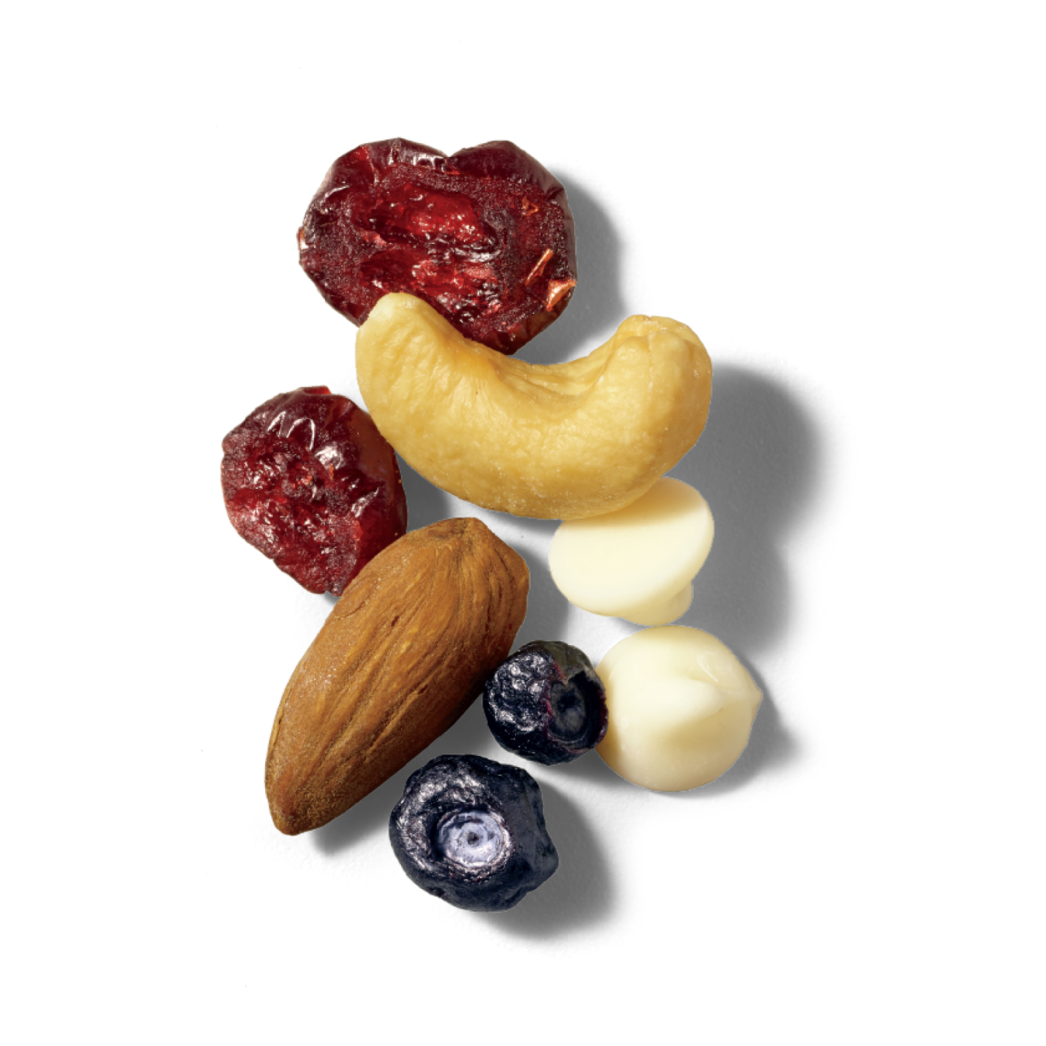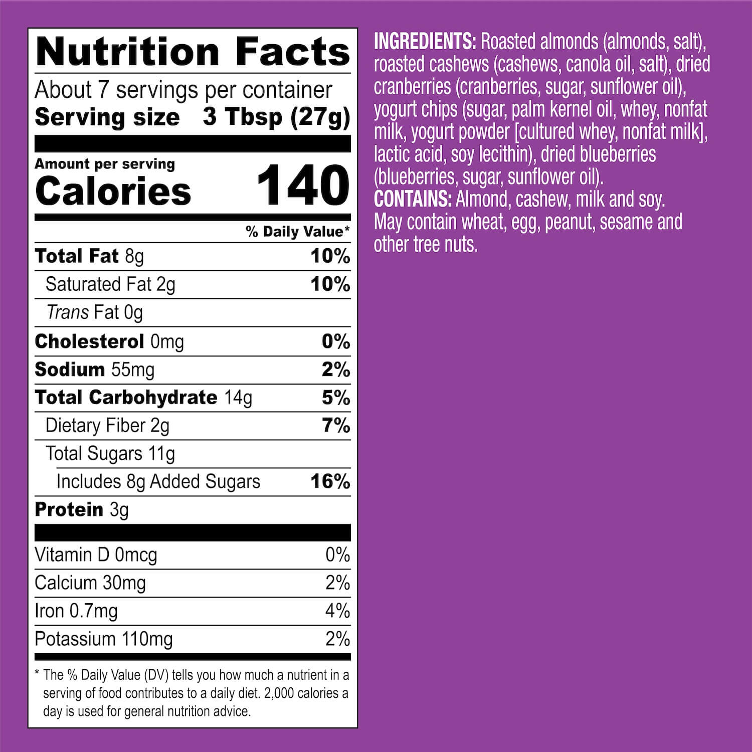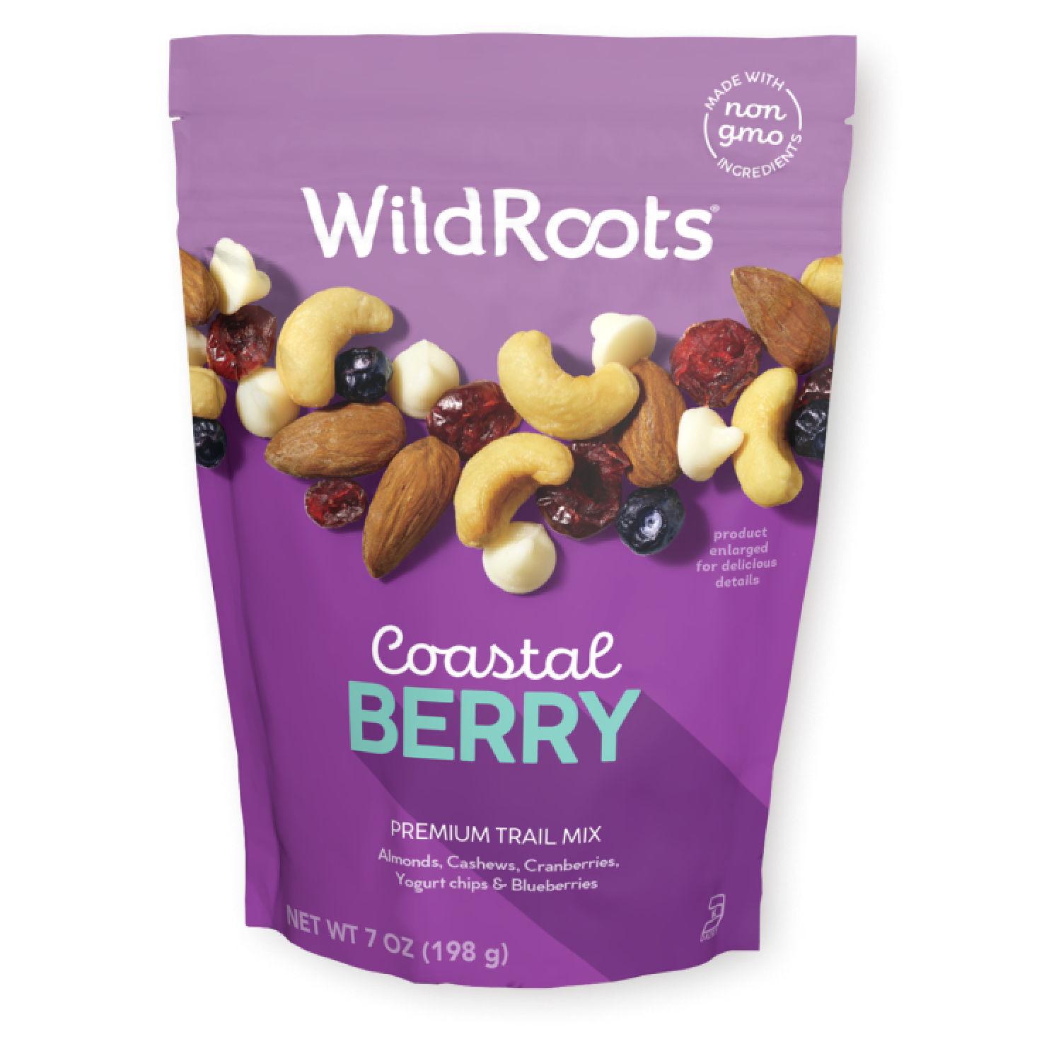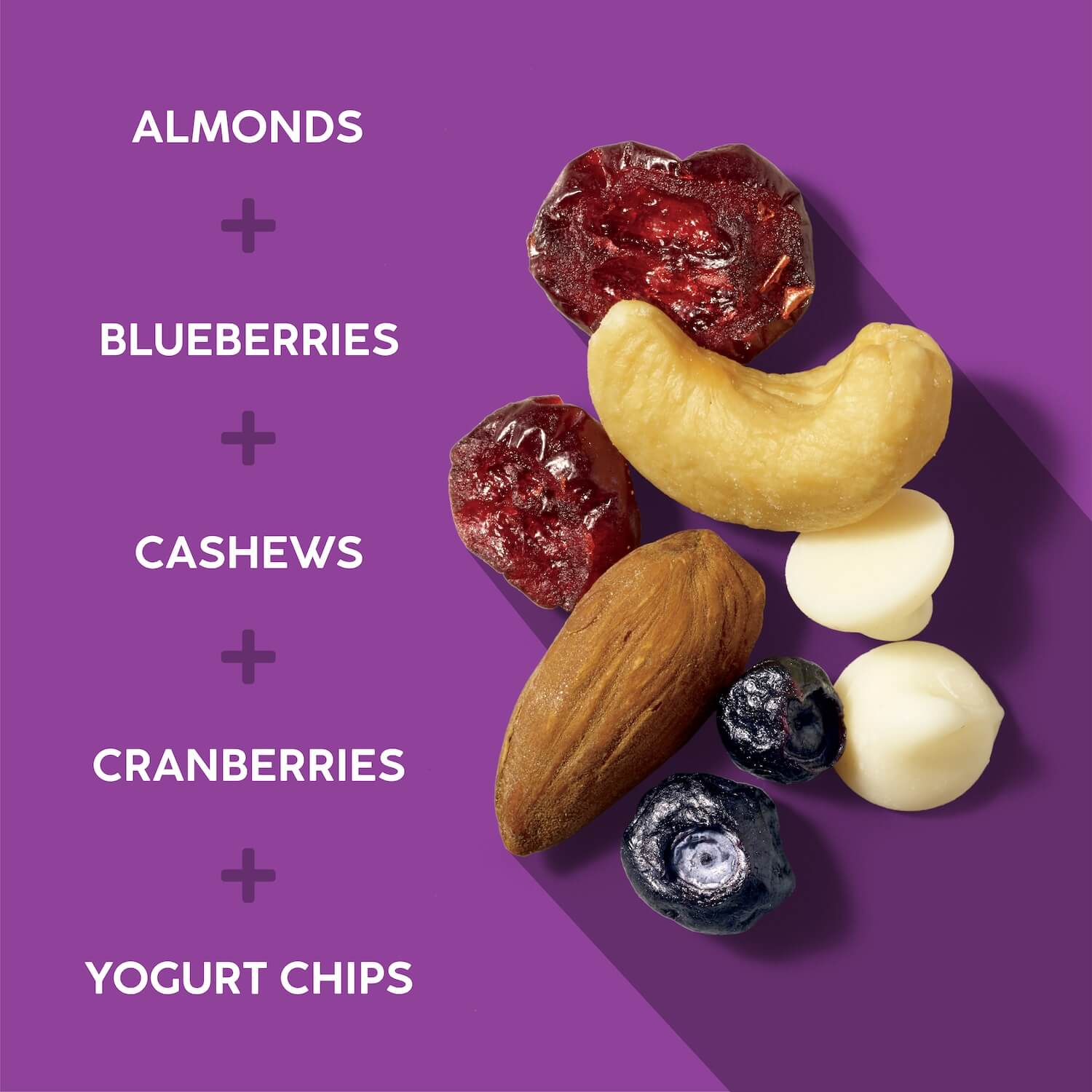 Our Coastal Berry Trail Mix starts with whole roasted almonds and cashews for crunch, with just a hint of salt added, then we blend in creamy yogurt chips, sweet cranberries, and blueberries for the perfect blend of sweet and salty.