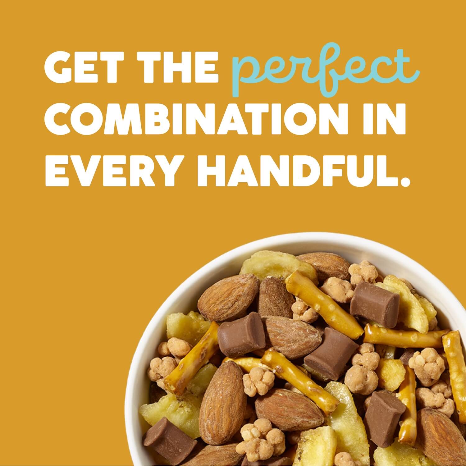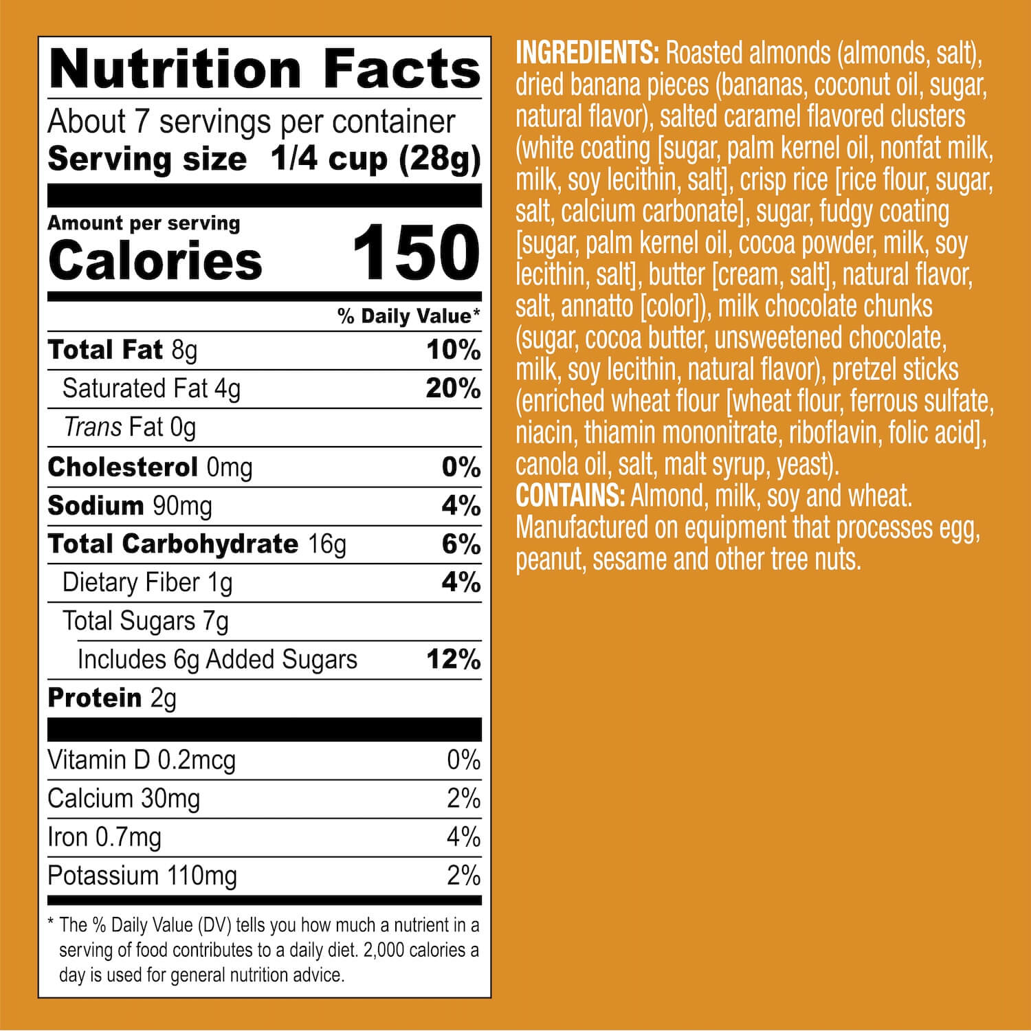 Roasted almonds (almonds, salt), dried banana pieces (bananas, coconut oil, sugar, natural flavor), salted caramel flavored clusters (white coating [sugar, palm kernel oil, nonfat milk, milk, soy lecithin, salt], crisp rice [rice flour, sugar, salt, calcium carbonate], sugar, fudgy coating [sugar, palm kernel oil, cocoa powder, milk, soy lecithin, salt], butter [cream, salt], natural flavor, salt, annatto [color]), milk chocolate chunks (sugar, cocoa butter, unsweetened chocolate, milk, soy lecithin, natural flavor), pretzel sticks (enriched wheat flour [wheat flour, ferrous sulfate, niacin, thiamin mononitrate, riboflavin, folic acid], canola oil, salt, malt syrup, yeast).